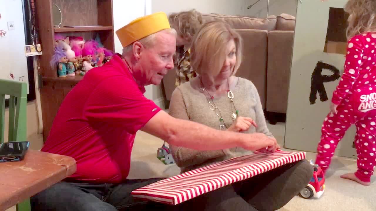 A senior man and woman open a Christmas present in the living room and get a picture frame with pictures of their grandchildren on it and then see an open spot for a new baby and they get excited and scream for their new grandchild. AA: Christmas
