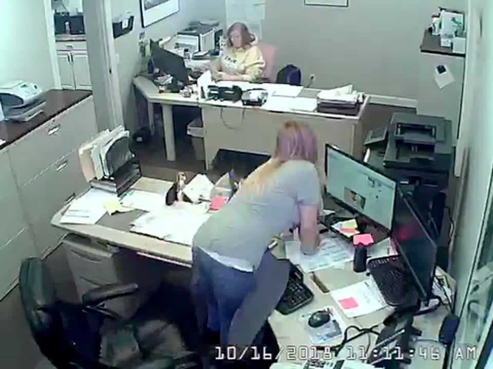 Security footage of a woman who falls at work when she tries to sit down in her computer chair after she pushes it back to grab a sheet of paper out of a copier.