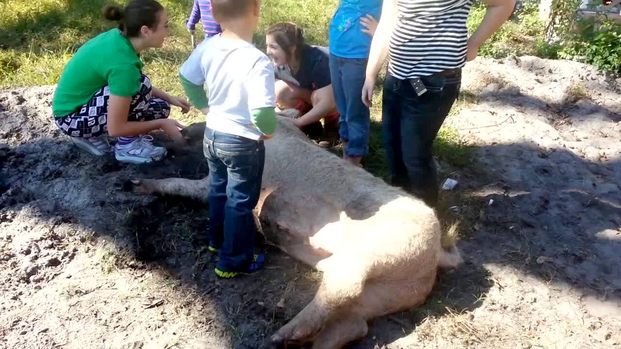 Four girls, a tot girl, and a tot boy look at a pig lying outdoors in the mud. The tot boy sits on the pig, which starts snorting and gets up, causing the boy to fall on the ground.