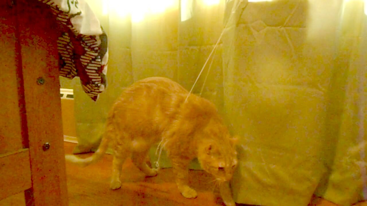 Orange cat is distracted by/ scared of a moving bird toy. Owner grabs cat. Cat jumps to camera. scare