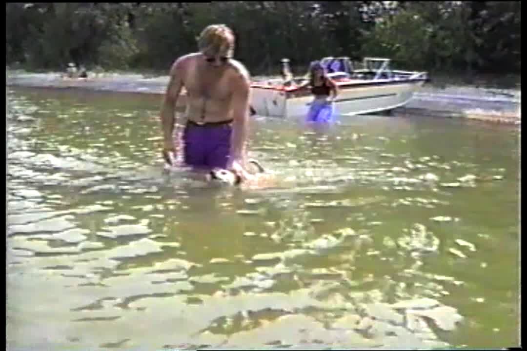 A puppy dog swims in water outdoors when a teen boy picks him up and he continues to paddle with his paws. Vine/Instagram.