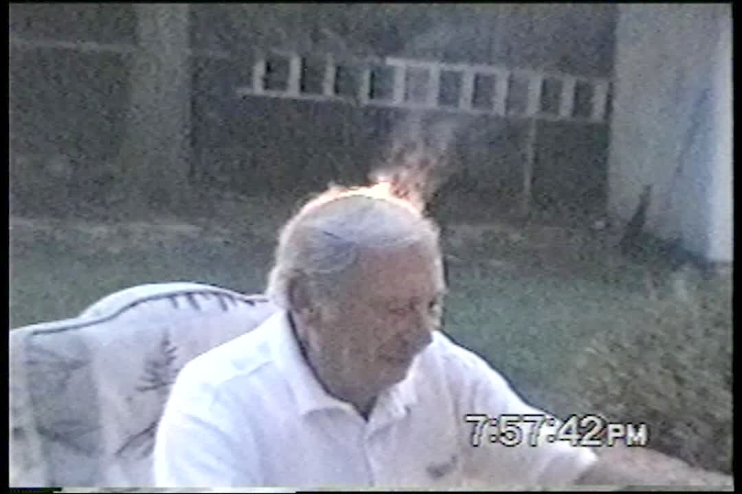 Illusion: man standing in front of Tiki torch looks like his head is in flames / on fire. *no audio, dark.