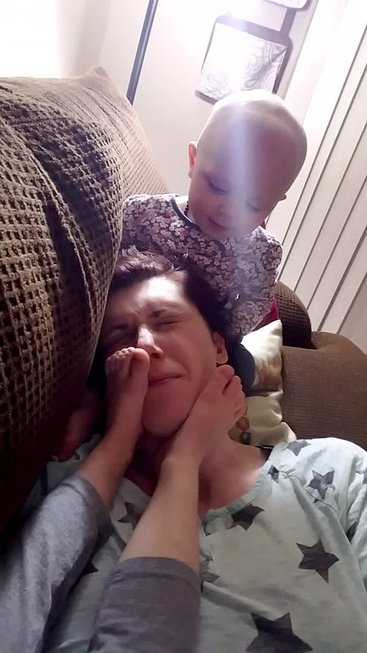 A woman records a video of herself in the living room while she lays on a couch and explains the struggle of having personal space as a mother while a tot boy sits behind her and plays with her hair and a tot girl lays on her lap and sticks her feet in her mom's face.