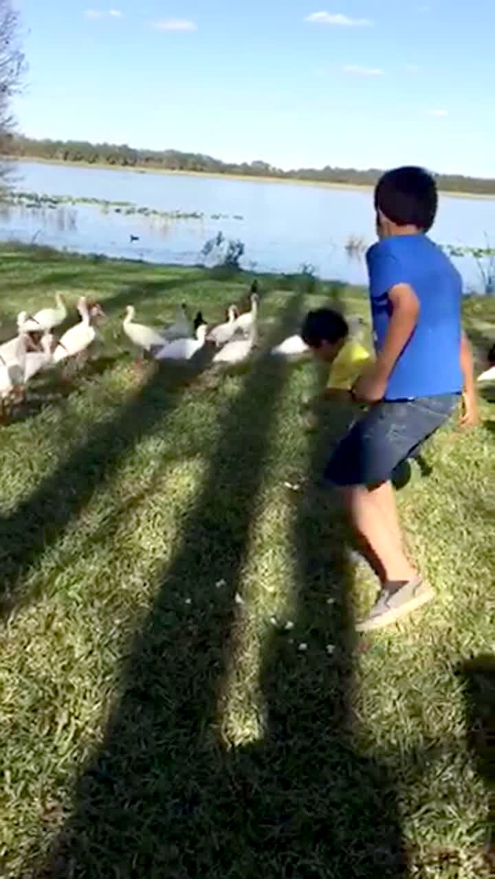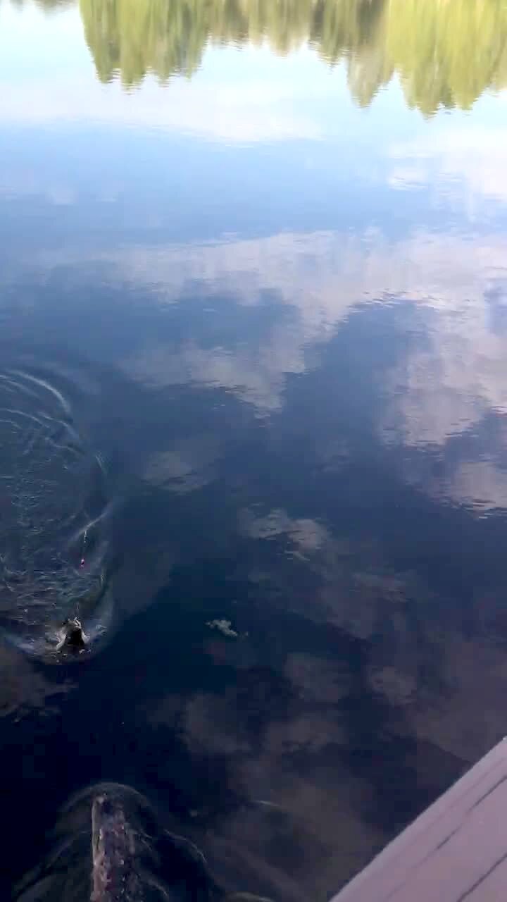 A young boy reels in a fish until an alligator eats the fish and swims away pulling the fishing line.