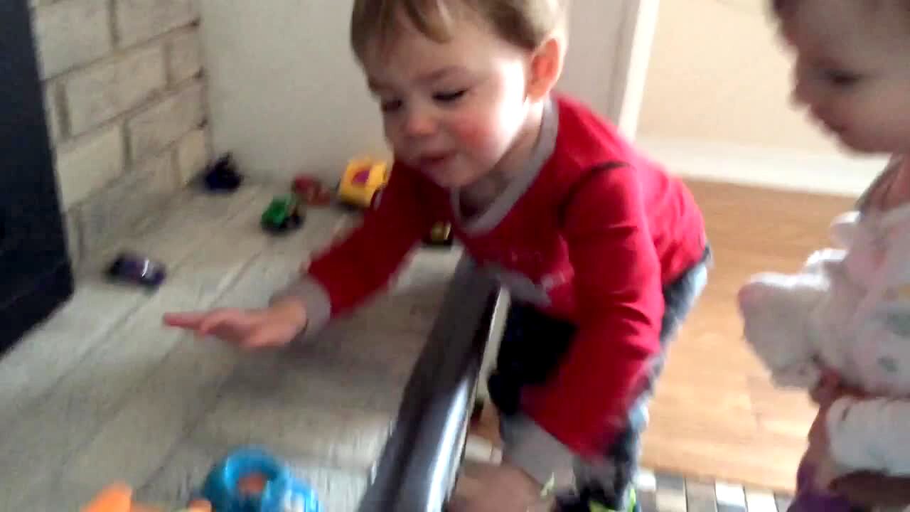 A tot girl carefully counts the cars she lined up along a fireplace at home before her twin brother slaps all the cars away one by one.