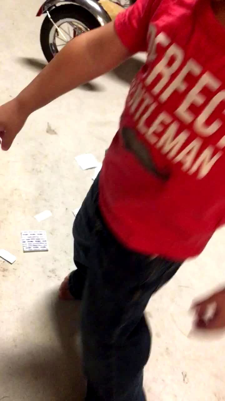 A tot boy shows his dad that he put band aids on dead crickets in the garage to help them with their "boo boos."