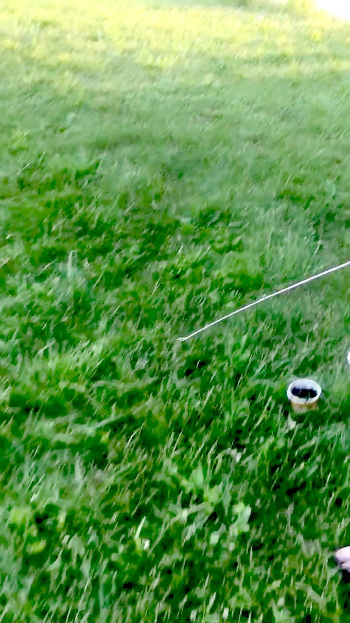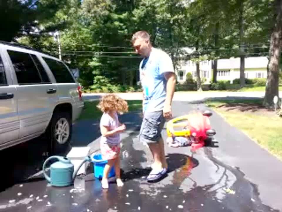 A man and a young girl introduce themselves for the ice bucket challenge in the driveway and a tot boy falls out of a toy car in the background.