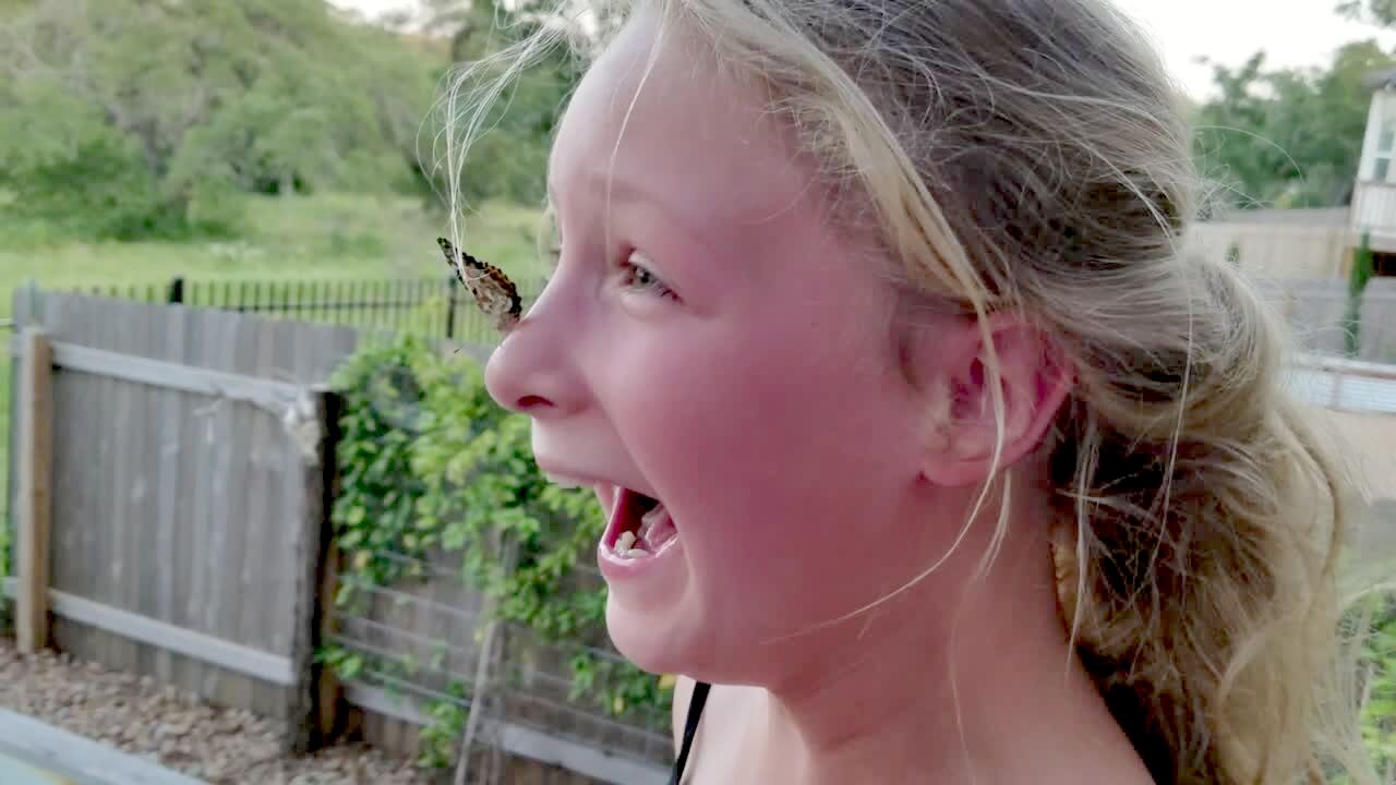 Several kids set butterflies free outdoors when one of them flies directly onto a girl's nose.