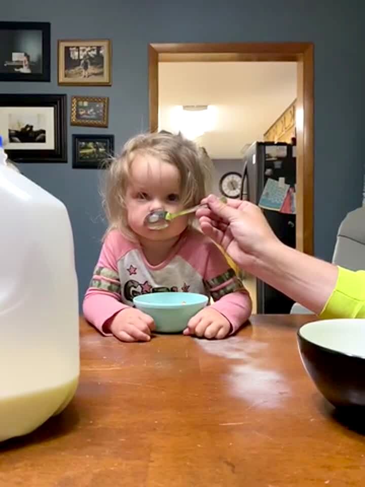 Tot girl pours out bag of cereal into bowl & all over table, dumps carton of milk all over table & floor. Mess. Breakfast, morning.