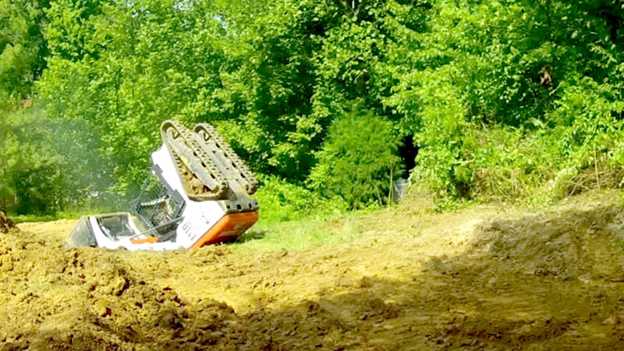 A man drives a Bobkat machine and tips it over backwards outdoors.