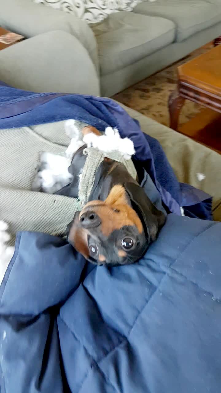 A dog climbs between couch cushions as he looks for a toy indoors and he disappears behind the cushion and whimpers. A man tells him to get out of the couch and the dog pokes his head out, then climbs out.