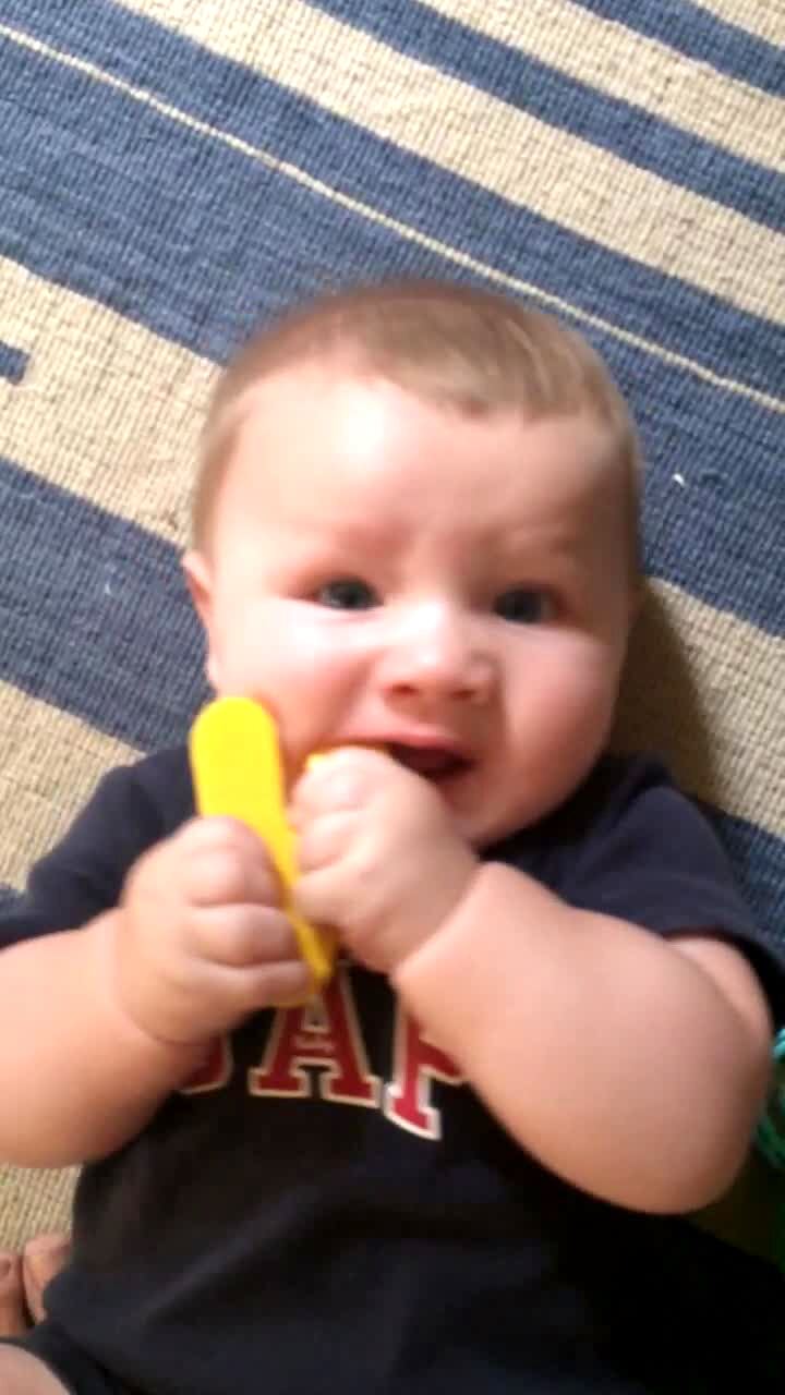 A baby boy puts an electric toothbrush in his mouth and winces, shakes and giggles at the vibration.