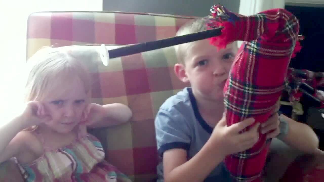 Little brother and sister sing Happy Birthday for Grandma. Girl dances ballet & hits boy in the eye, he cries. Long for edit. Performance problems. Sibling rivalry.