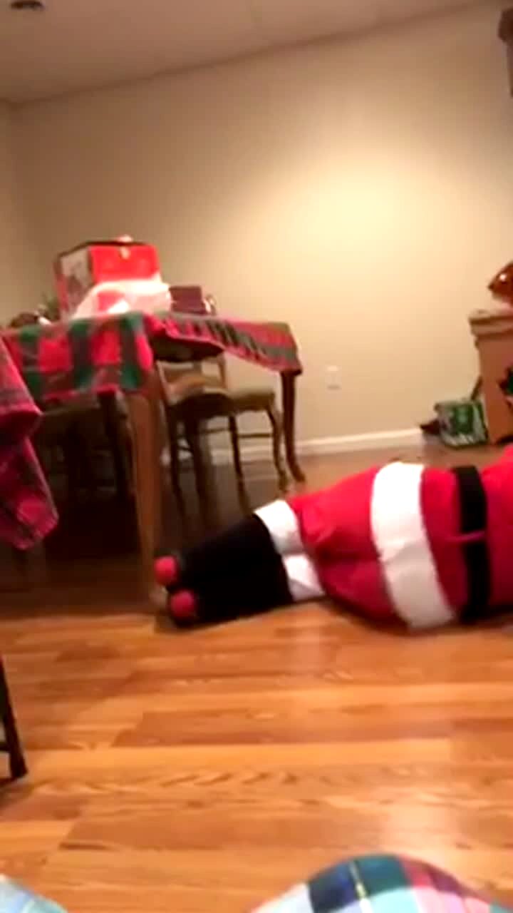 A cat sneaks up on a Christmas Tree toy indoors. The toy has a motion sensor that turns it on, so when the cat gets close, the face on the tree comes alive and it sings Christmas songs and the cat runs away scared. AA: Christmas