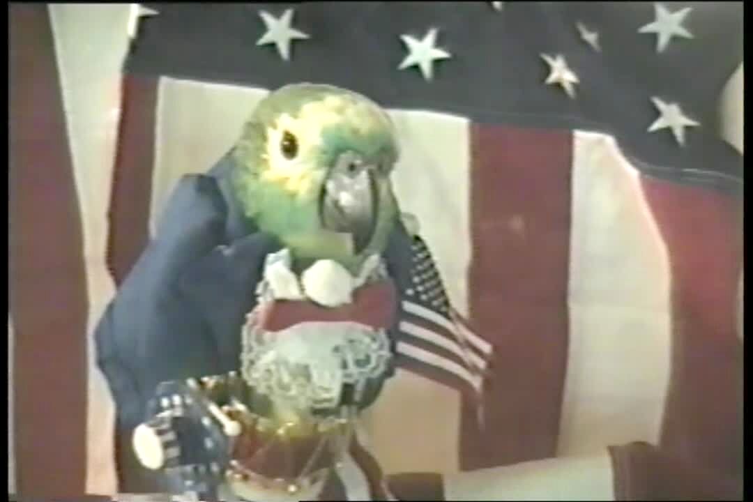 Bird dressed as Uncle Sam with a flag in his hand sits in front of a flag.