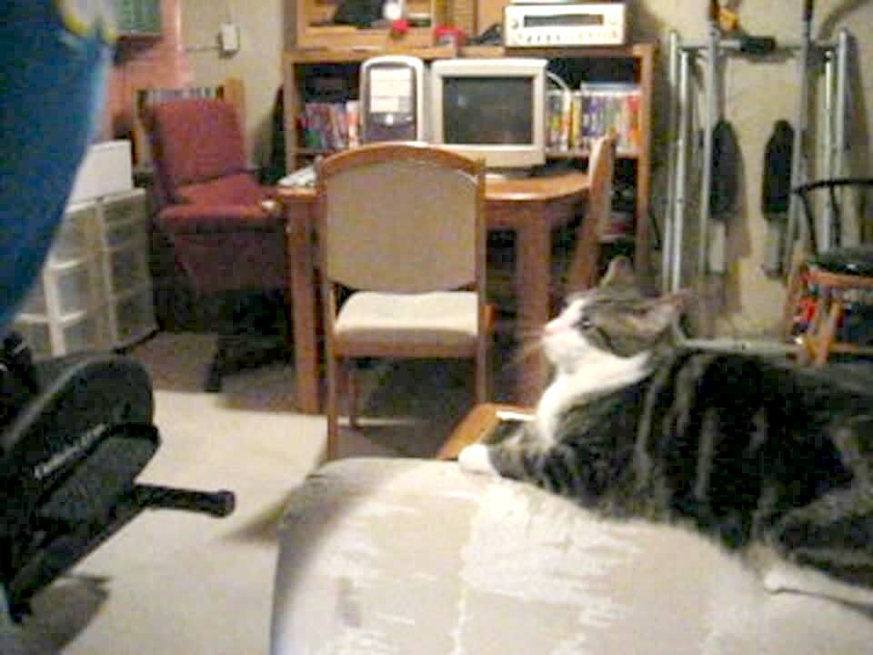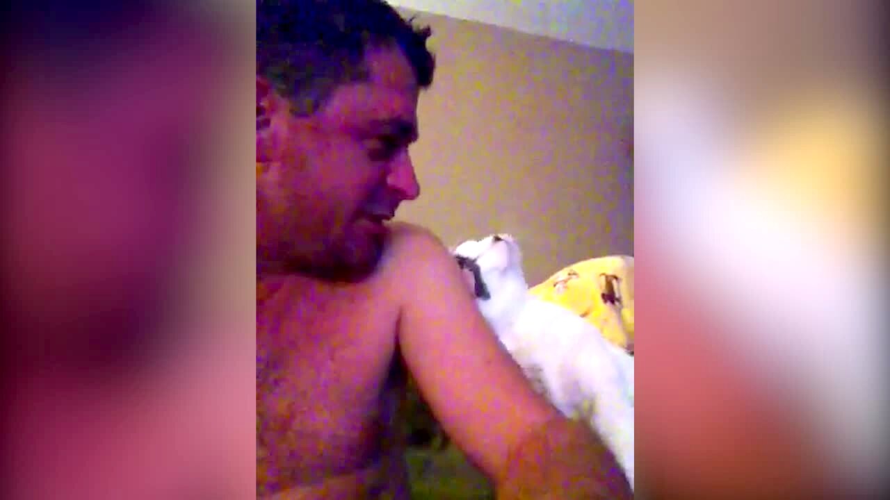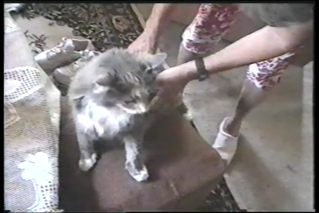 Man leans over cat making noises & teasing it. Man turns his head, cat reaches up & scratches man's nose. No tail.