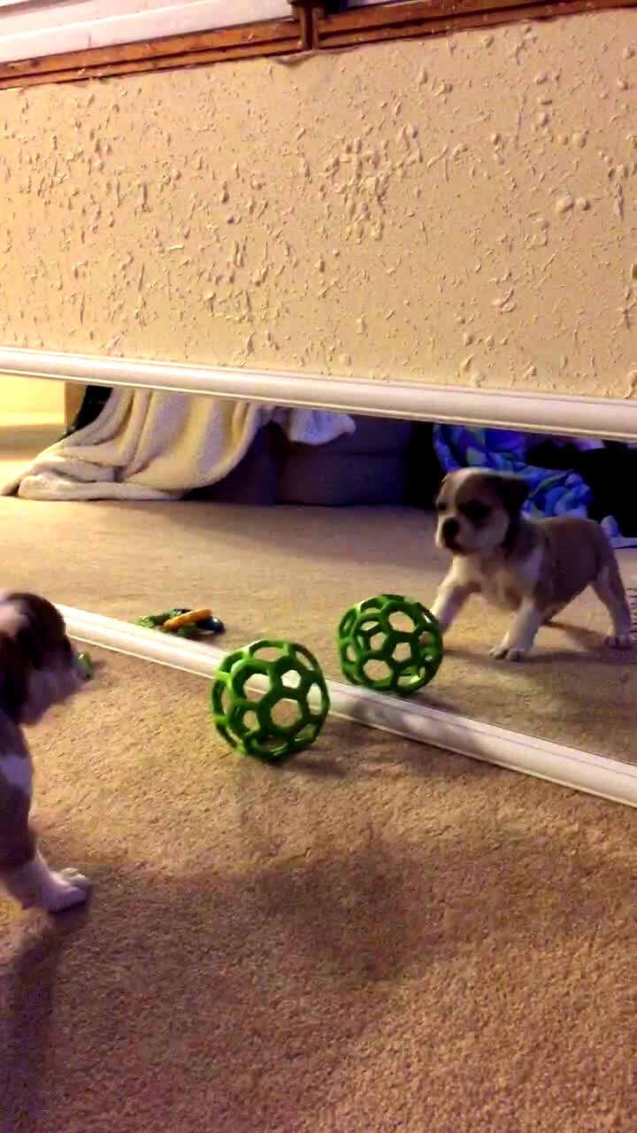 An English Bulldog puppy dog sees his reflection in a mirror and charges at it repeatedly until the mirror falls over and the dog runs away.