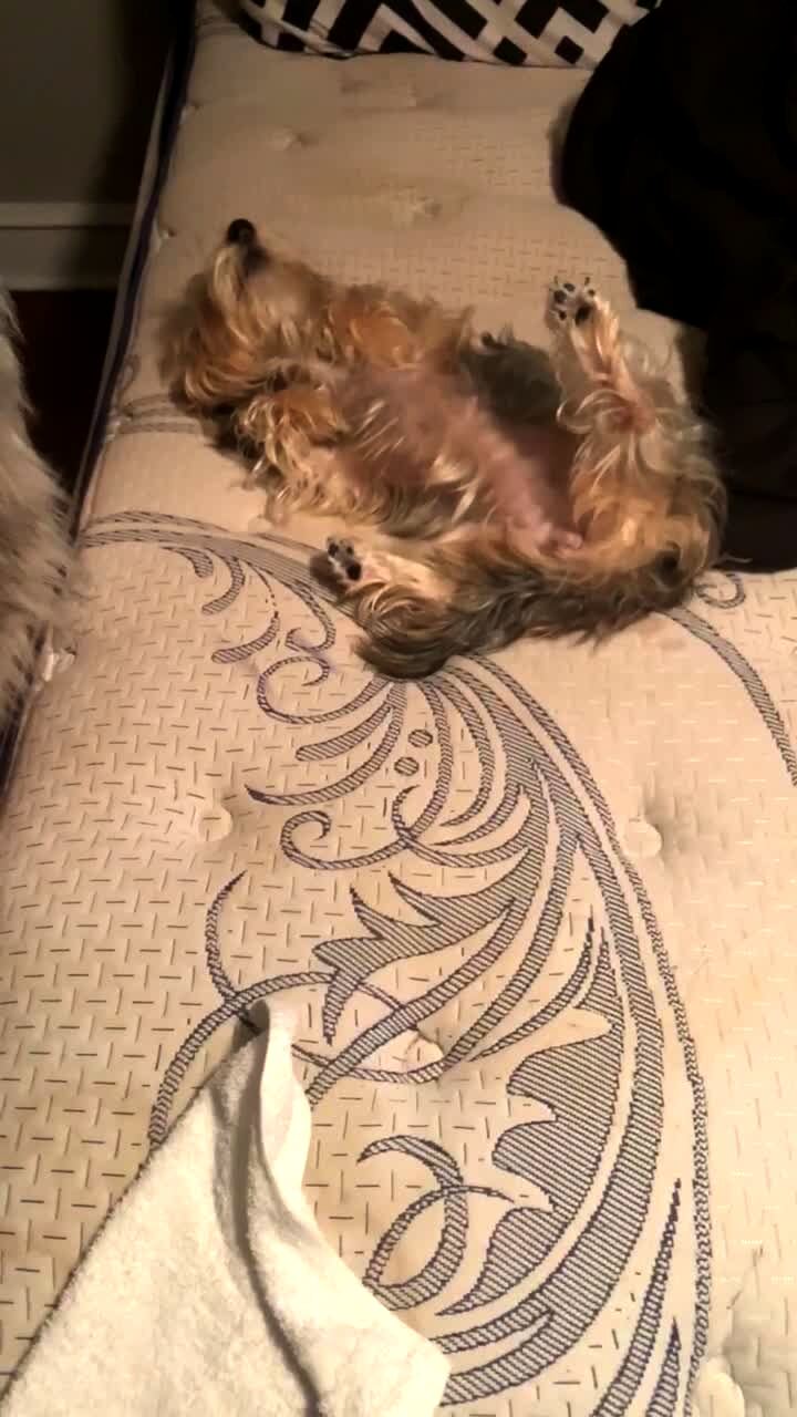 A small dog shows teeth and twitches in his sleep and barks while dreaming.