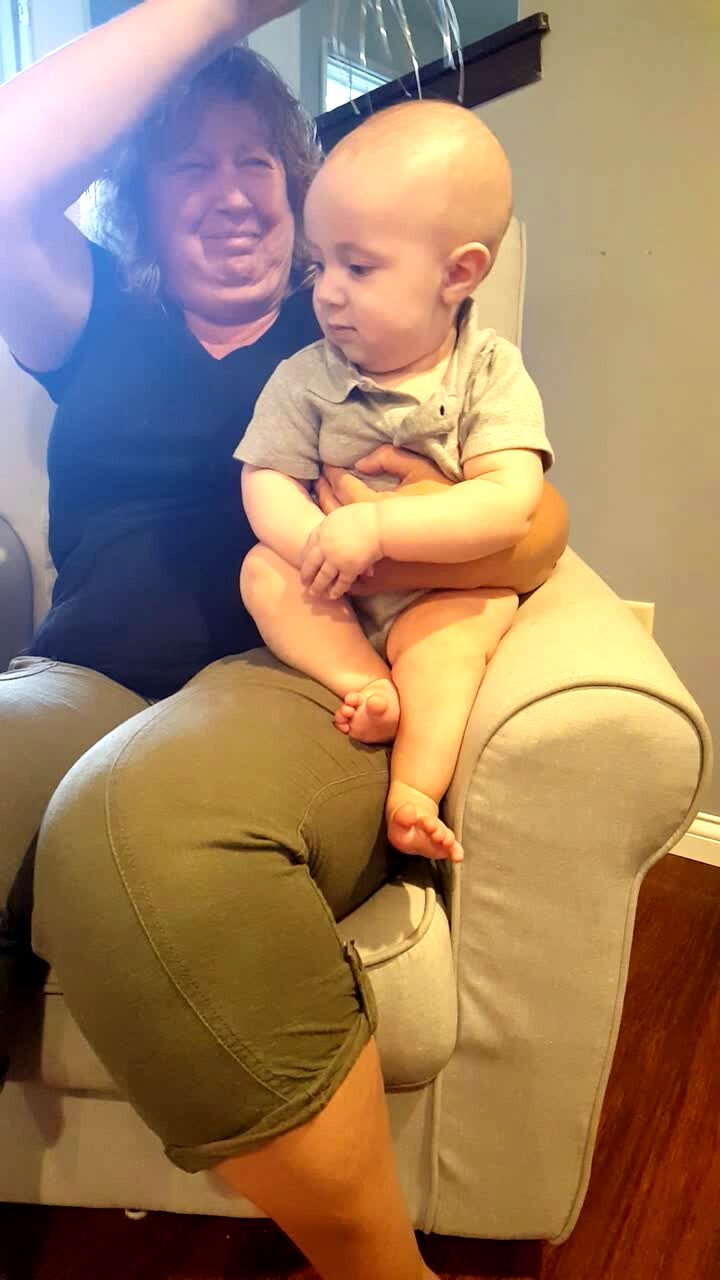 Baby likes to bit Grandma's chin. Baby shakes her head & bites down.