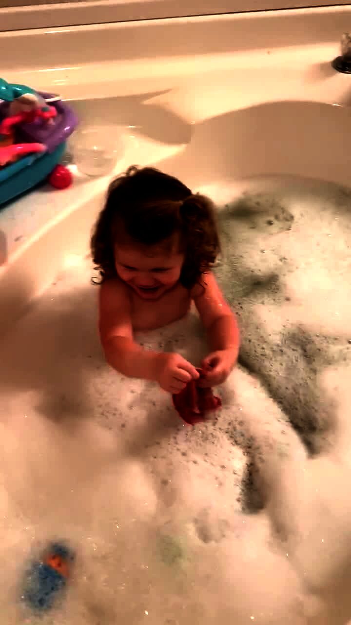 A mom follows a trail of soap bubbles through a house and into a bathroom that is covered in bubble bath soap as two young girls play in a bathtub. The mom says it is a disaster and the girls laugh.