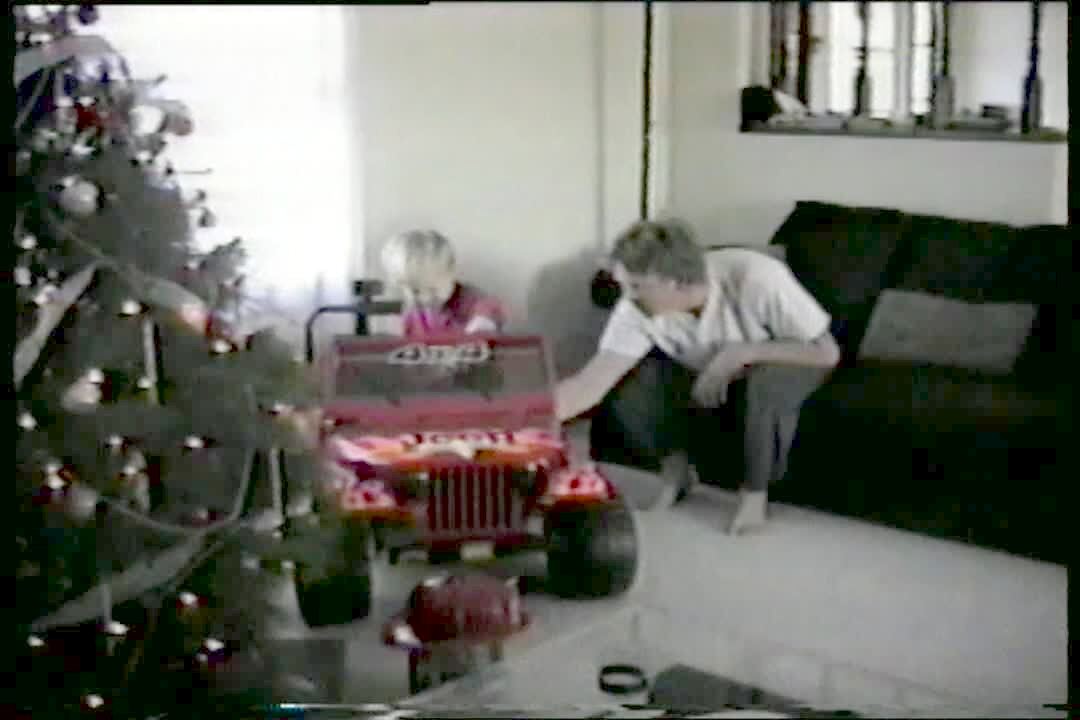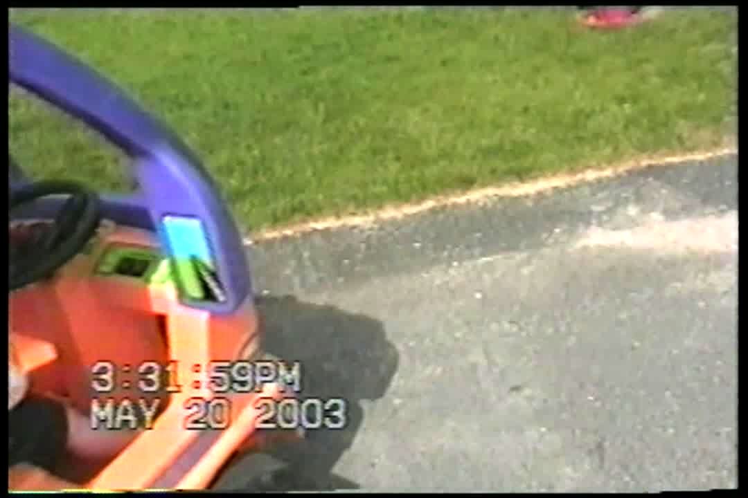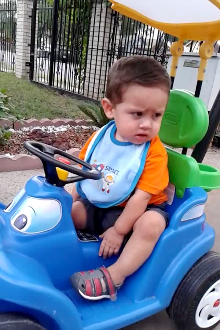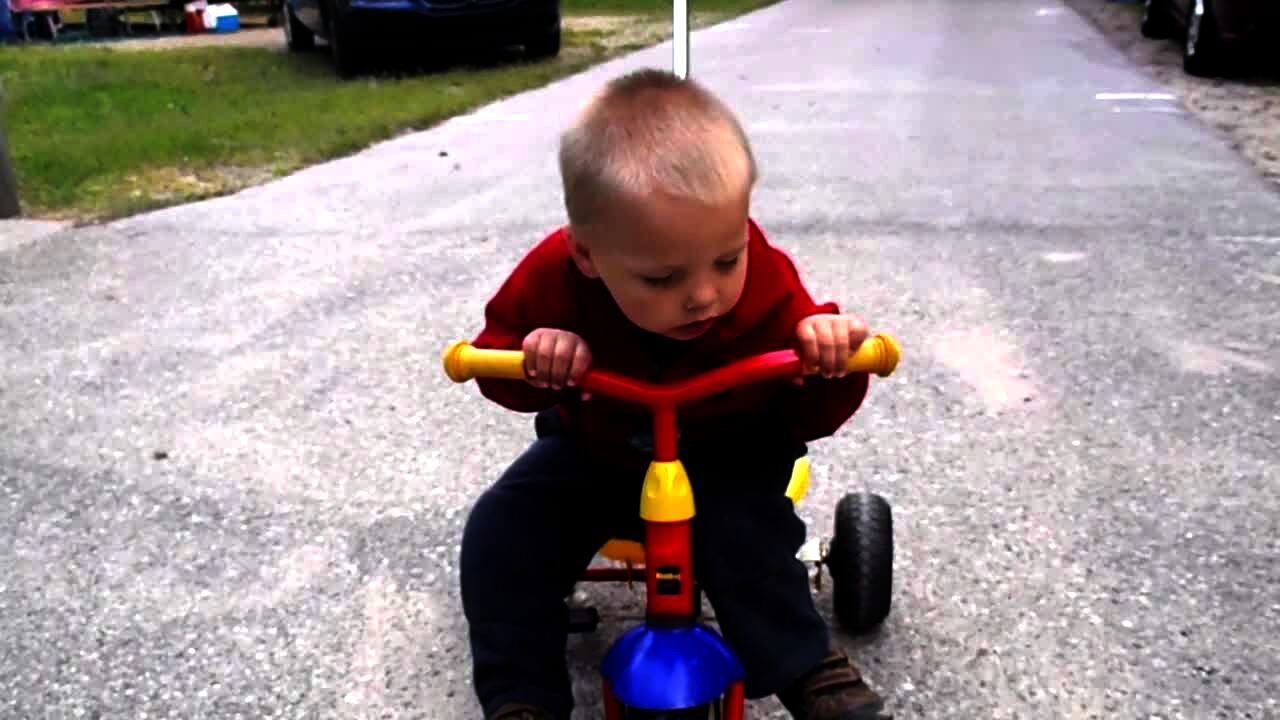 A tot boy falls asleep at the wheel of his toy tractor and then crashes into a metal object and scares himself awake.