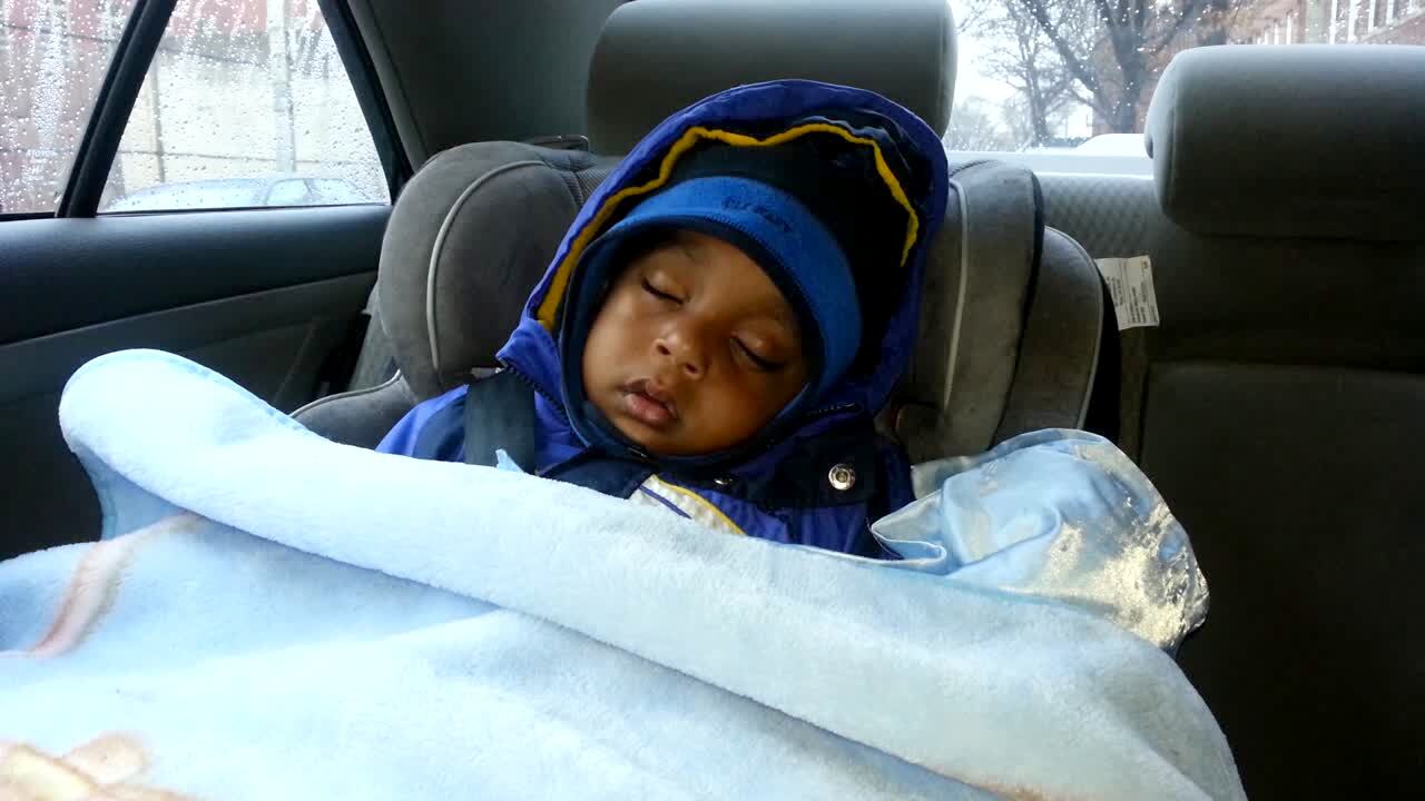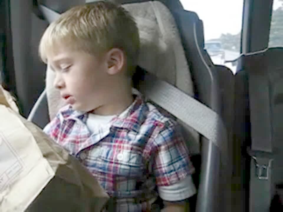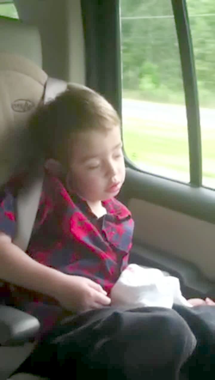 A tot boy is falling asleep in a car. His head hits the door at 0:13 and 0:33.