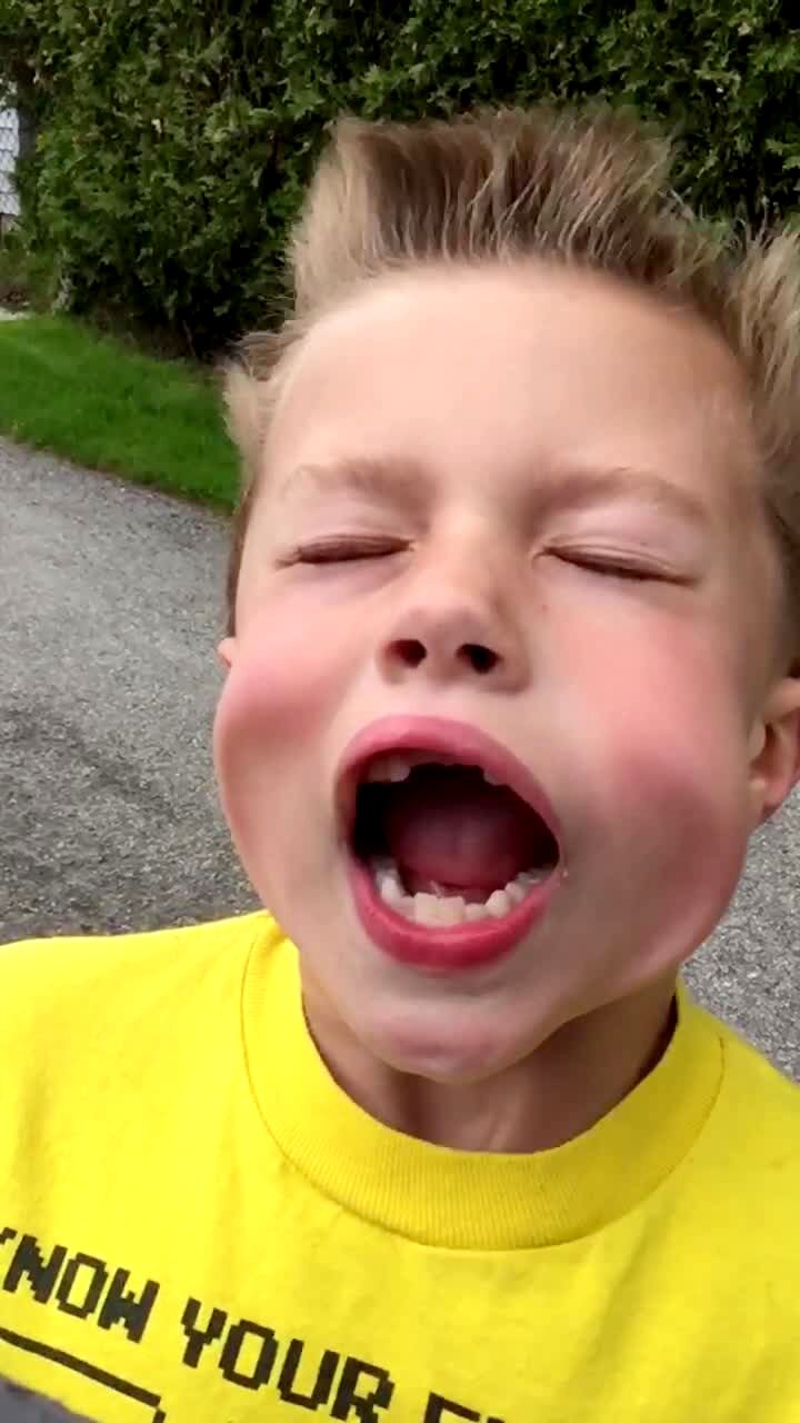 A young boy opens his mouth while the camera holder points a leaf blower at him.