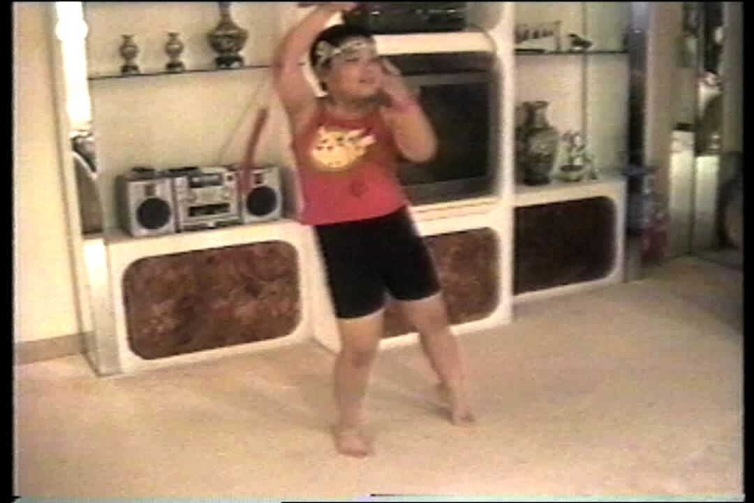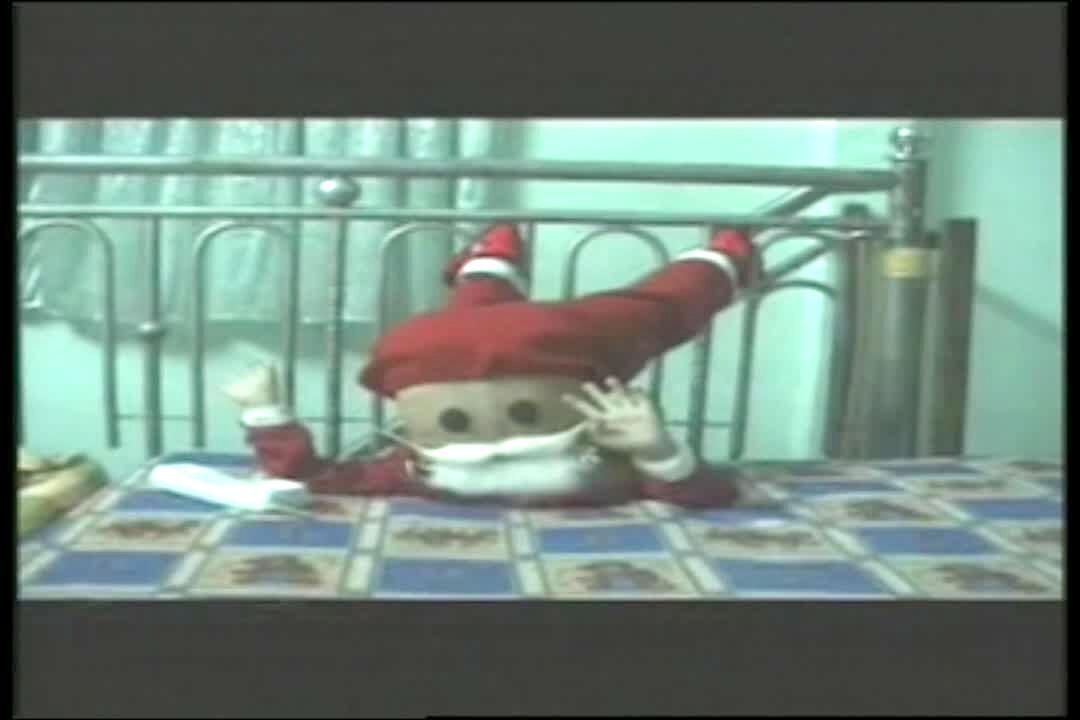 Young boy talks to camera, then puts his feet over his head. Has Santa Claus drawn on his back.