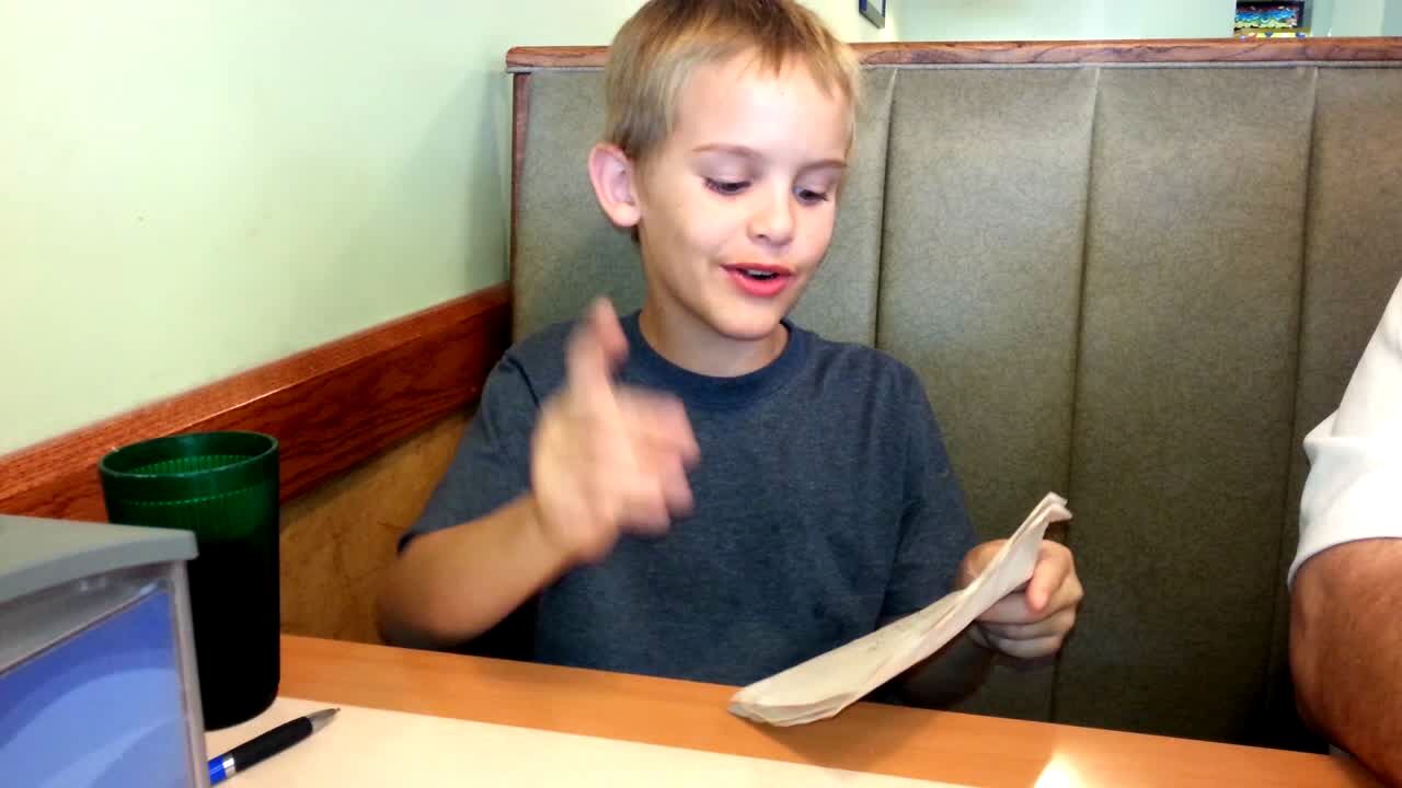 A woman asks her young son in a restaurant booth "If you had 25 apples and I gave you 16 more apples, how many would you have" and he says "Why do you have so much apples?"