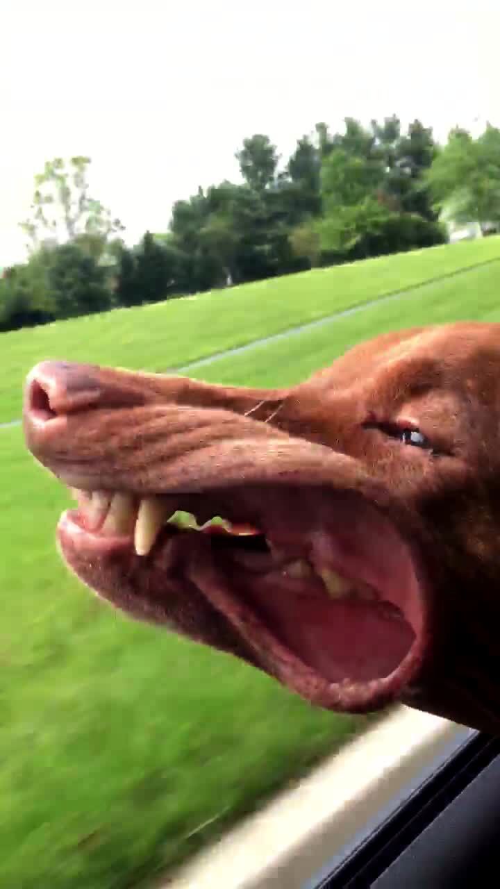 A dog's lips are held out by the wind while the dog sticks its head out a car window.