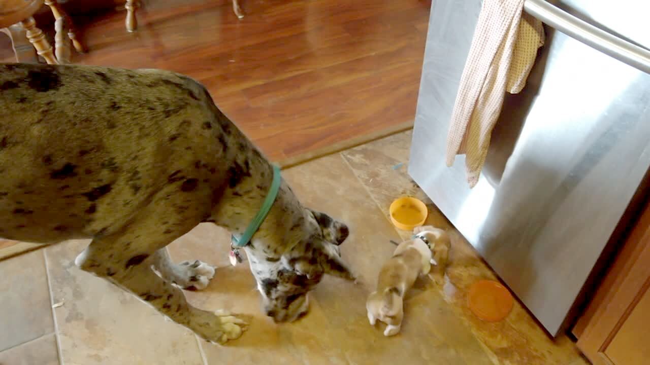 "Doggy versus Goliath" A Great Dane dog barks at a puppy dog eating out of a bowl and the puppy dog barks at the Great Dane dog and won't get him near the food bowl. The puppy dog jumps at the Great Dane and hits the refrigerator.
