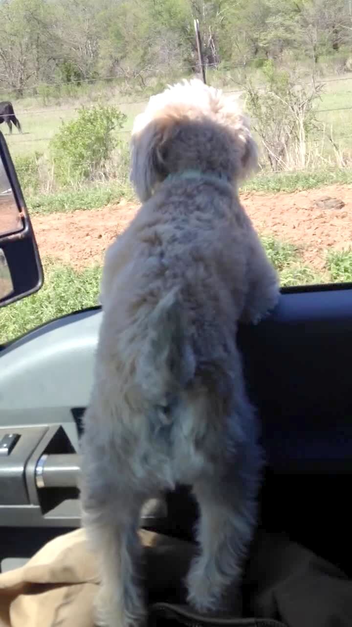 A dog barks at a cow while riding in a car and then jumps out of the car window to chase the cow.