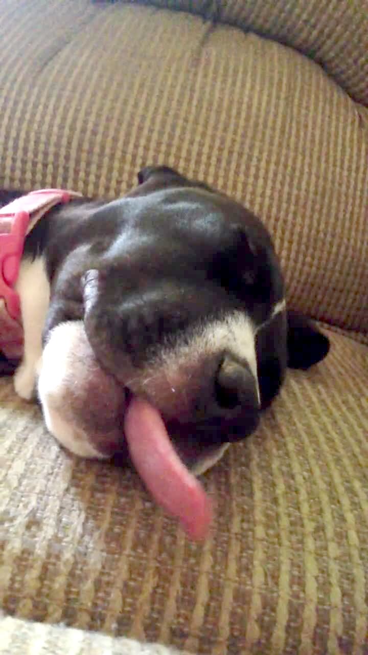 A small dog shows teeth and twitches in his sleep and barks while dreaming.