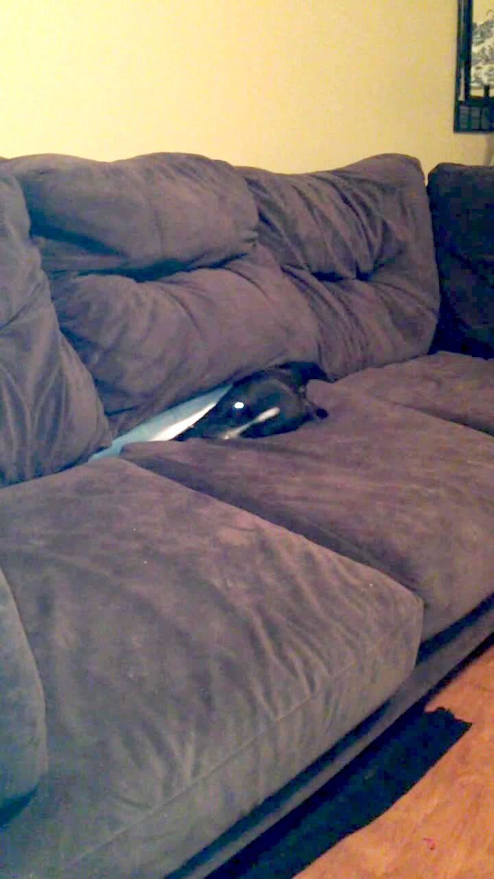 A dog climbs between couch cushions as he looks for a toy indoors and he disappears behind the cushion and whimpers. A man tells him to get out of the couch and the dog pokes his head out, then climbs out.