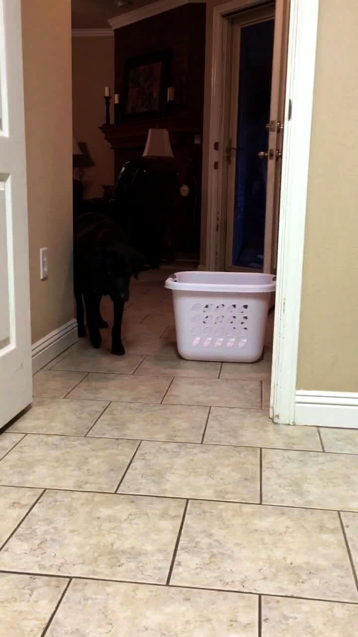 A woman records a video of her dog and explains that she is afraid of laundry baskets and in order to help her get over the fear, she sits in a room and puts a treat on the floor and places a laundry basket in the doorway. She calls the dog over, but it won't walk past the basket, so another dog runs into the room and takes the treat and leaves.