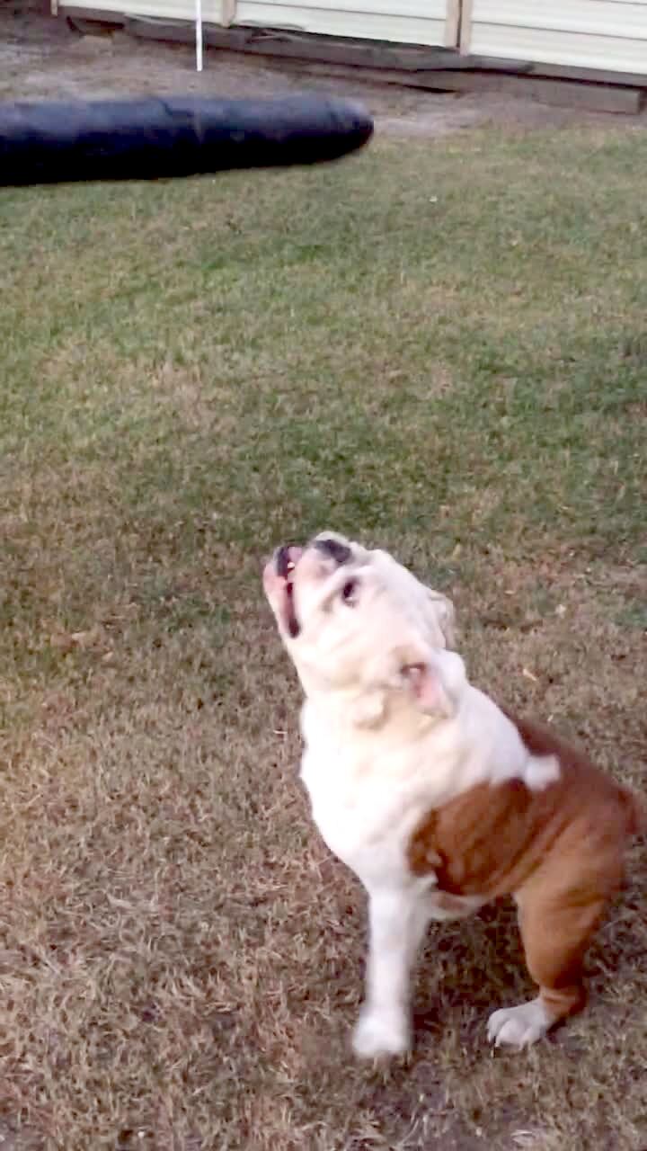 A Bulldog dog barks and bites at a leaf blower outdoors. The air flares its jowls back