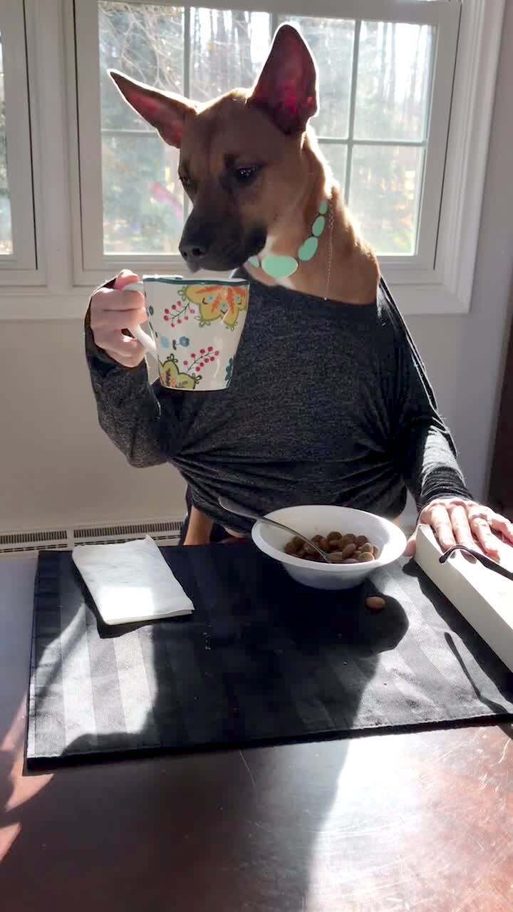 A dog with human hands eats cereal and drinks from a mug.