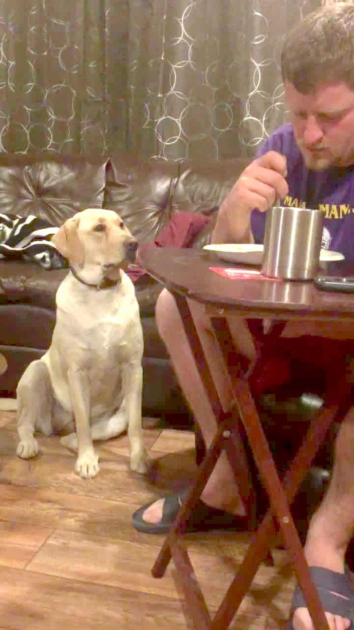 A dog watches a man eat in the living room and whenever the man turns to look at the dog, the dog looks away and pretends that it wasn't watching him.