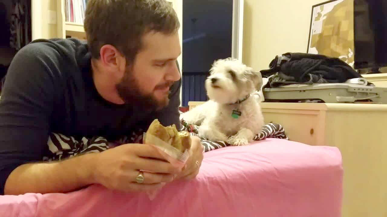 Bacon cooks on a stove in a kitchen and the camera zooms in on a puppy dog and it looks like it really wants the bacon.