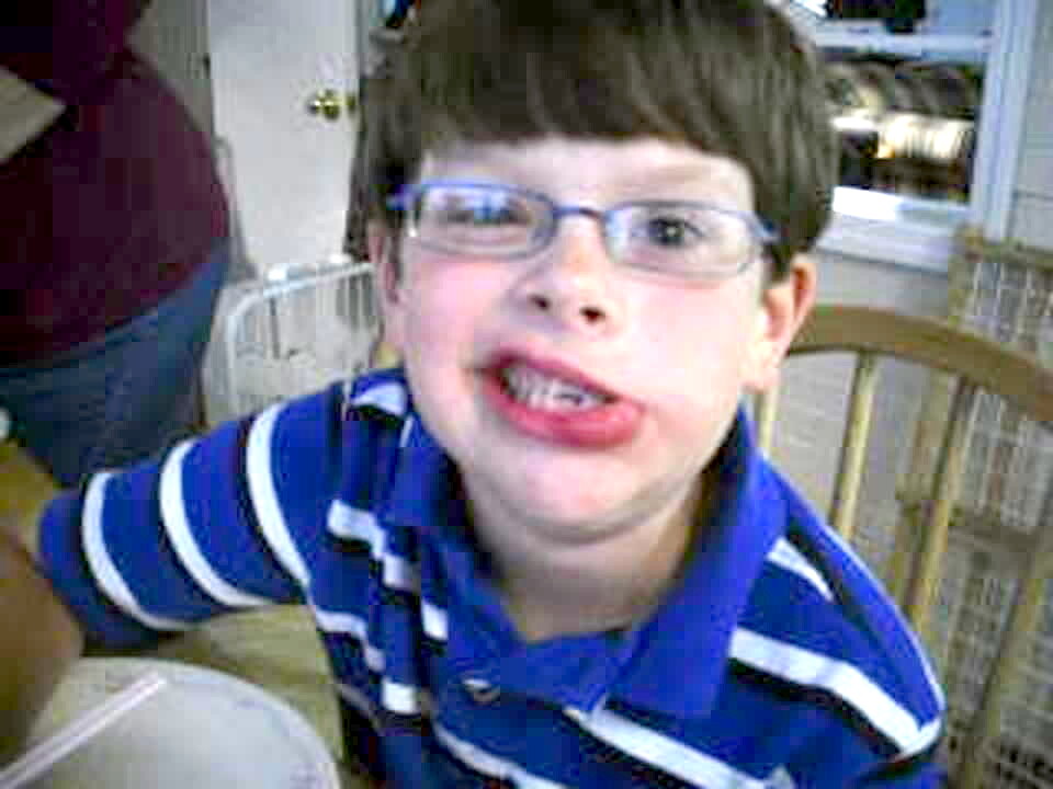 A boy laughs at the dinner table with a fat lip at home after going to the dentist. He has bitten his lip and cannot feel it.