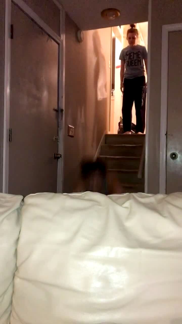 A teen girl pushes her friend down the stairs on a mattress but trips and falls over her and rolls down the steps