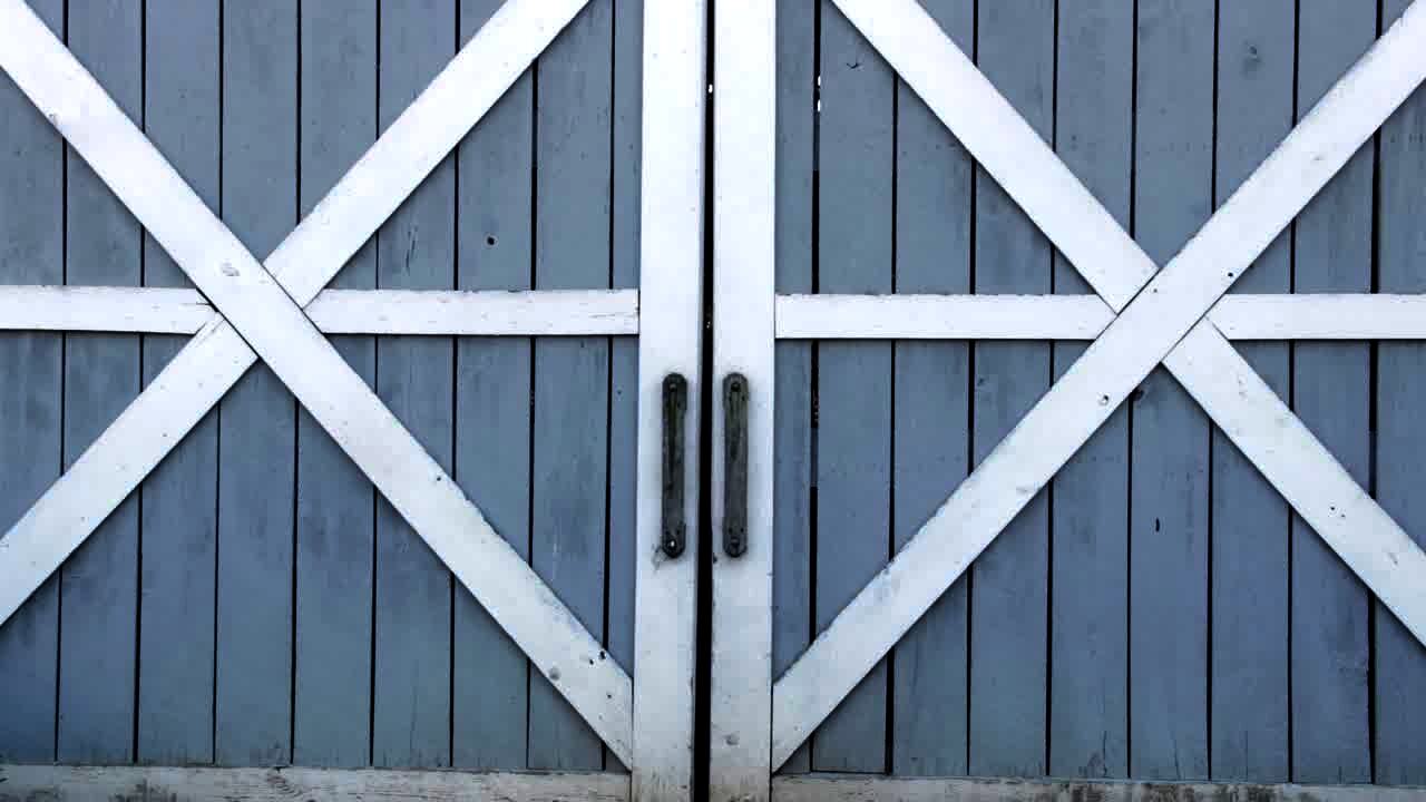 A woman in a wedding dress falls down when she walks out of a barn as the doors open.