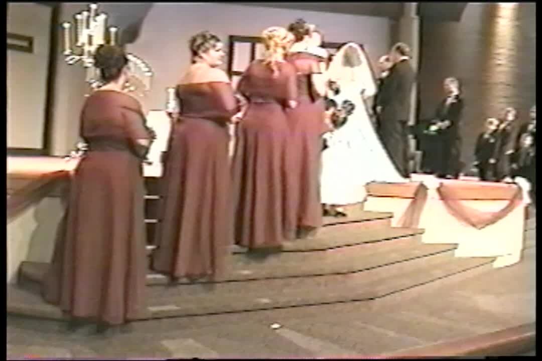 Bride & groom are saying vows when a large pillar falls on the bride. She catches it & pushes it up, 2nd pillar falls on groom. Long for edit, good recovery. Wedding ceremony.
