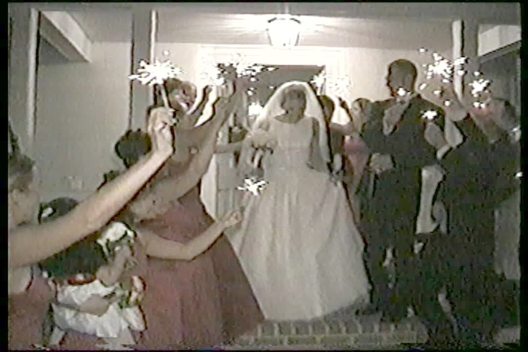 A wedding photographer falls backwards into a fountain while photographing the bride and groom taking their first steps together as a married couple. Featured talent cleared (photographer, bride and groom).