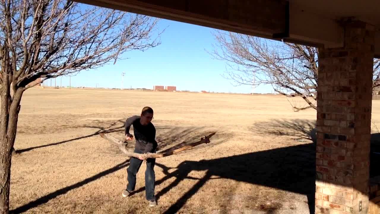 A man runs at a slab of plywood with a large stick. He pokes the plywood and drops the stick, but as he walks away, the plywood wobbles and falls on his head. Bonehead