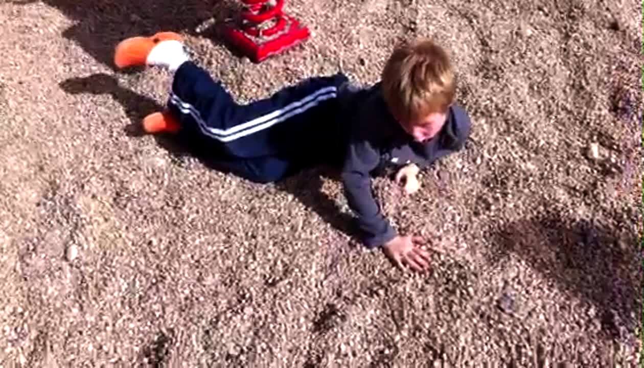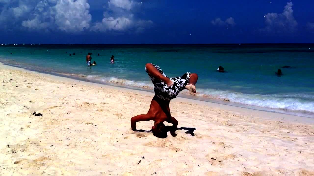 A boy tries to do a backhand spring at a beach and hits his head, covering himself with sand.
