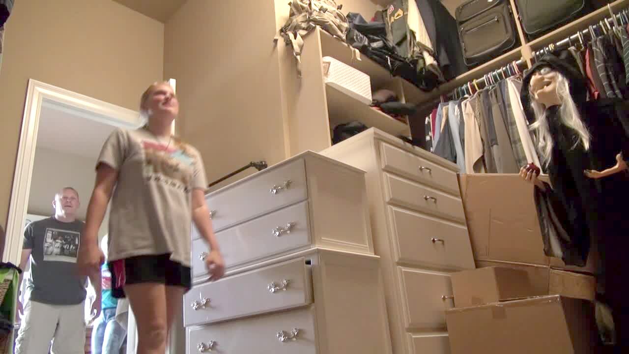 A teen girl walks into a closet and is scared of a witch halloween prop.