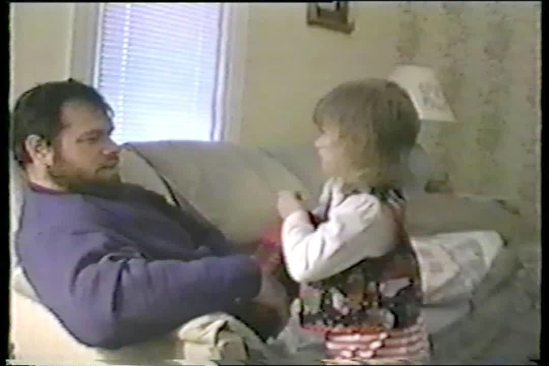 A young girl jumps and runs away from skeleton halloween decorations at her father's office when he claps to make them move and talk as she and her tot sister stand in front of them.