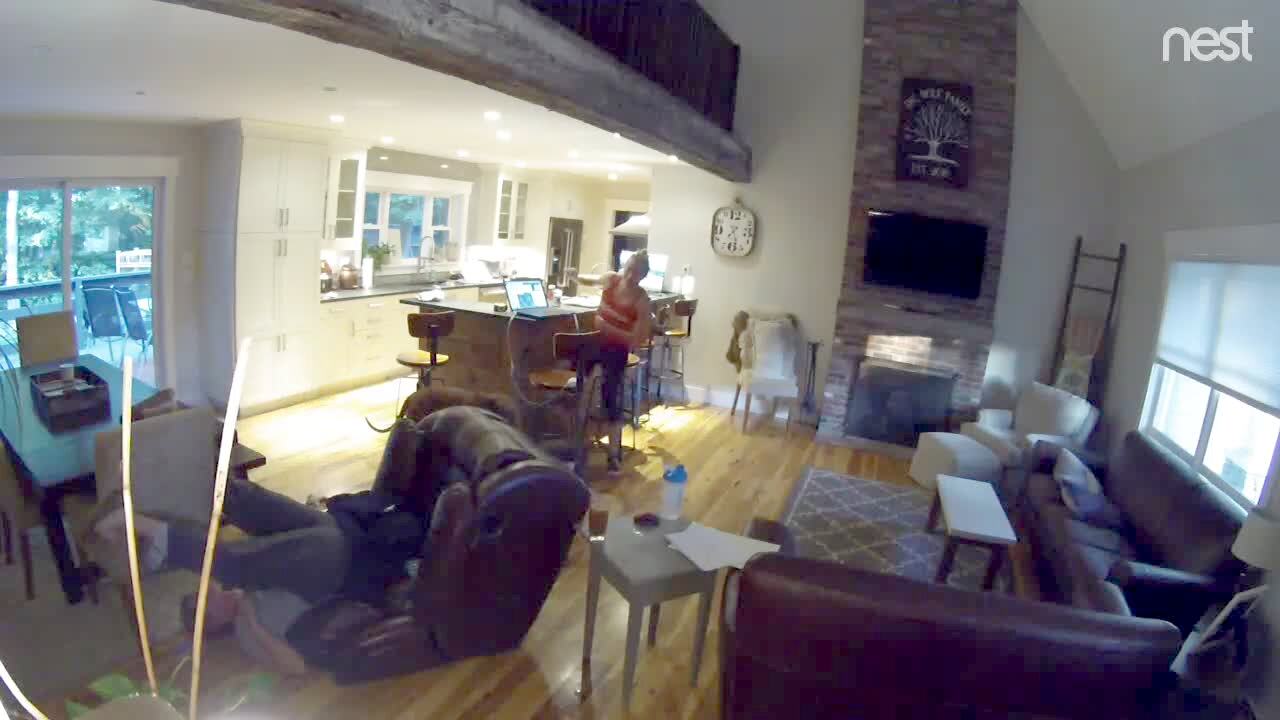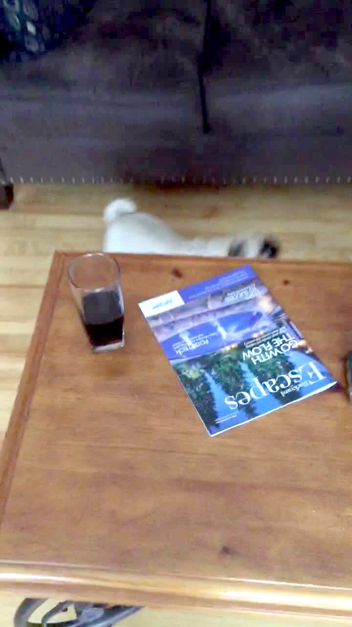 A woman says "you are very sleepy" to a pit bull dog in a living room, and the dog turns around to stare at her.