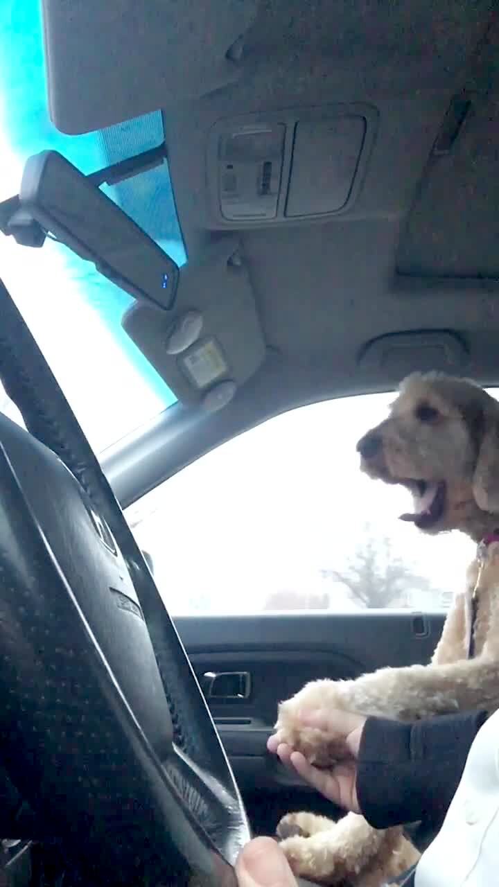 A small dog growls on a living room couch while she sits next to dog treats, then she jumps forward, and a woman laughs.